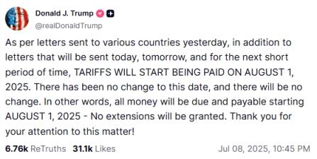特朗普8日在社交媒体“真实社交”上写道:“根据昨天发给各国的信函,以及今明两天和接下来一段时间内将要发送的信函,关税将于2025年8月1日开始实施。”