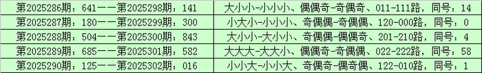 排列三第2025298期-第2025302期连续5期奖号为:141-300-843-582-016。