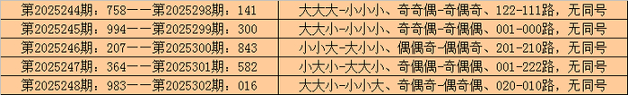 所以,排列三第2025249期奖号:532,与排列三第2025303期奖号可能没有同号。且排列三第2025303期奖号大小比、奇偶比和012路比不会与第2025249期奖号直选形态:大小小、奇奇偶和202路全部相同。